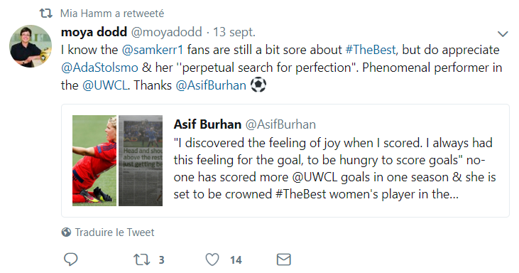 Véritable légende du Football, Mia Hamm a raccroché ses crampons mais est restée sur les bords des terrains aux Etats-Unis. La Championne du Monde continue en effet de suivre le développement et les progrès du football féminin américain, mais aussi mondial. Comme en témoigne son retweet du tweet de Moya Dodd, ce vendredi 14 septembre 2018, qui a repris l'interview en anglais d'Asif Burhan, au sujet de notre rencontre avec Ada Hegerberg.